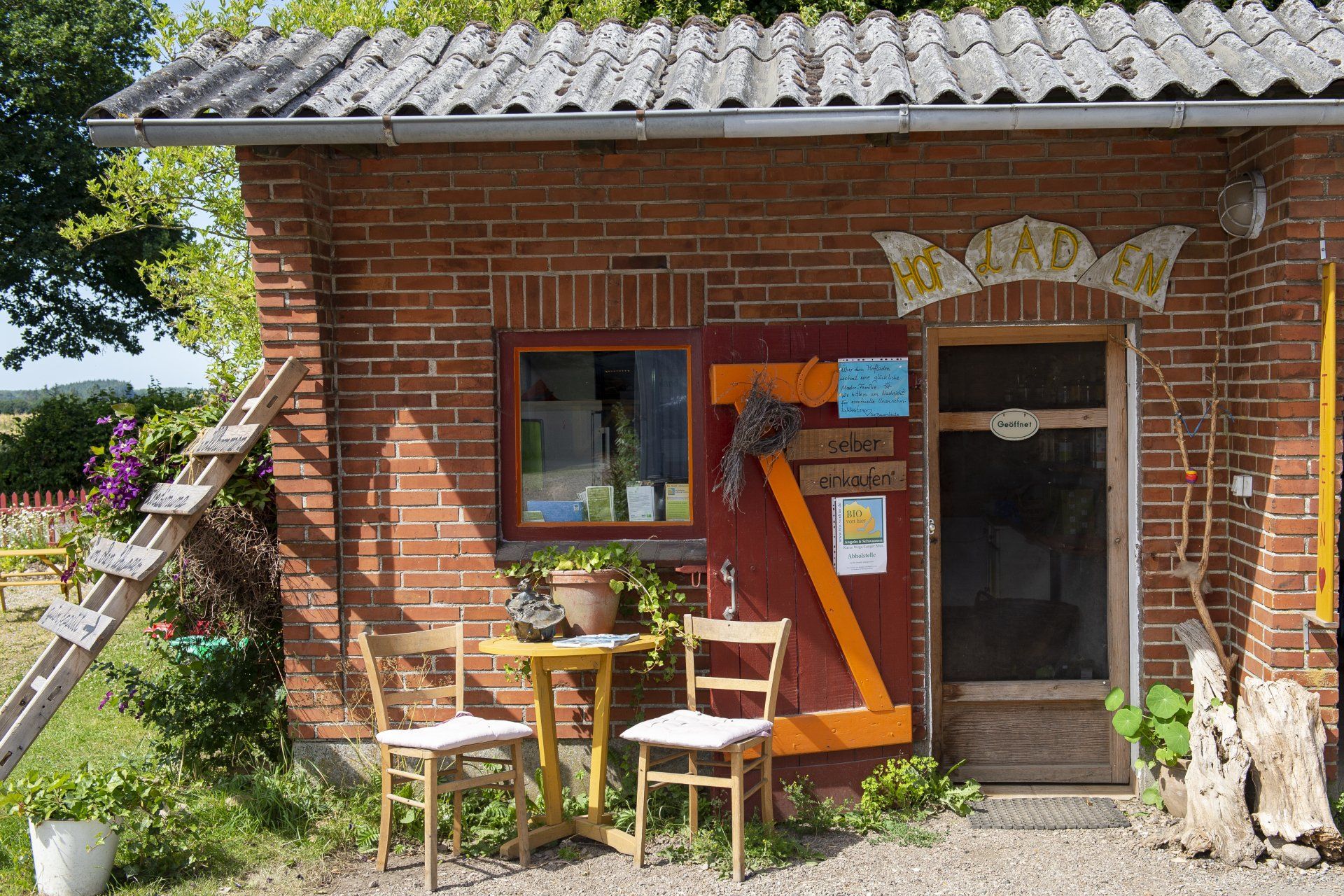 Neben dem Hofladen lädt ein kleiner Garten zum Verweilen ein.